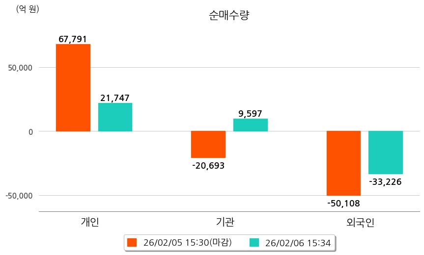 투자자별 동향을 살펴보면 기관은 9,597억 원 순매수했으며, 외국인은 33,226억 원 순매도했다. 개인은 21,747억 원 순매수했다.