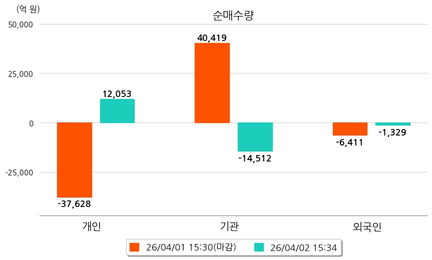 투자자별 동향을 살펴보면 기관은 14,512억 원 순매도했으며, 외국인은 1,329억 원 순매도했다. 개인은 12,053억 원 순매수했다.