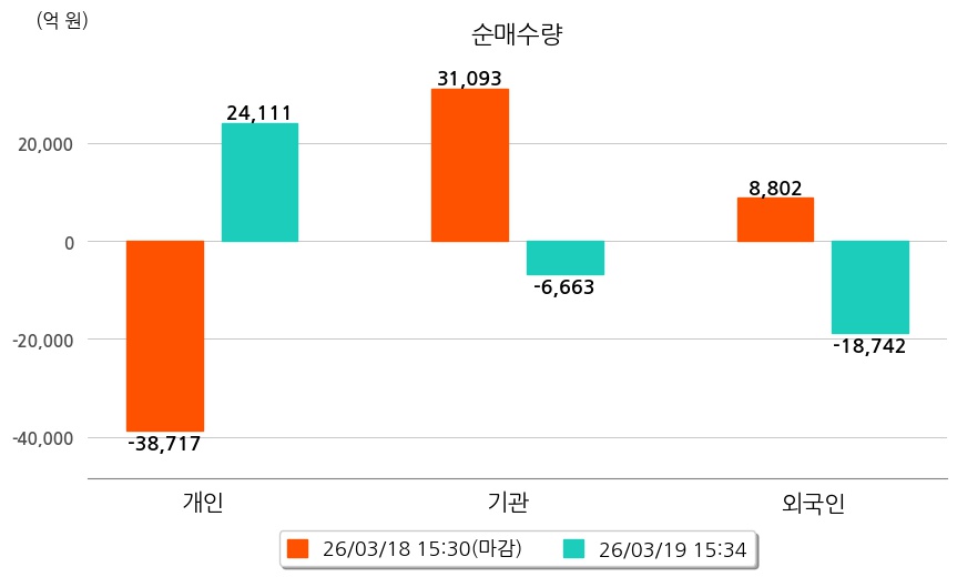 투자자별 동향을 살펴보면 기관은 6,663억 원 순매도했으며, 외국인은 18,742억 원 순매도했다. 개인은 24,111억 원 순매수했다.