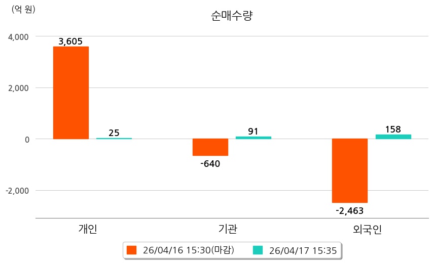 투자자별 동향을 살펴보면 기관은 91억 원 순매수했으며, 외국인은 158억 원 순매수했다. 개인은 25억 원 순매수했다.