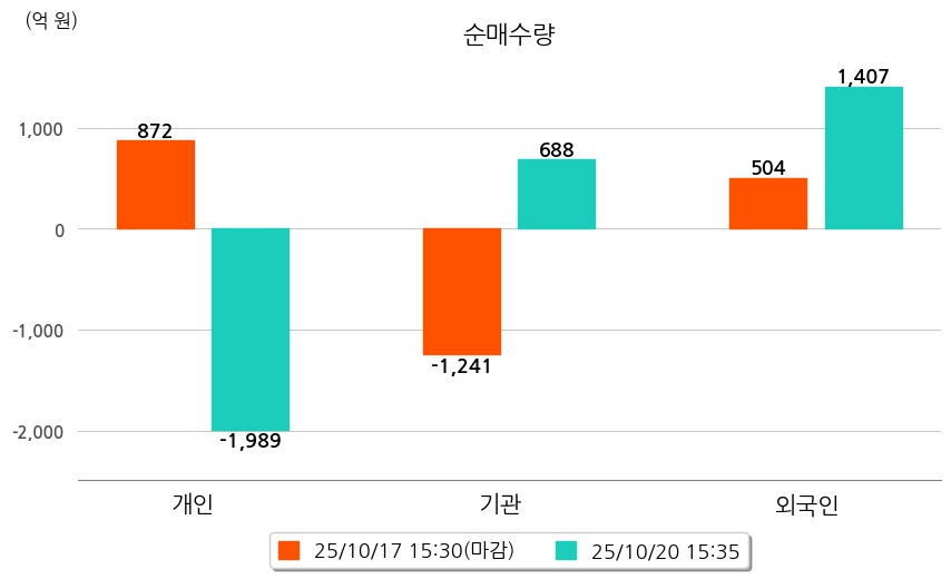 투자자별 동향을 살펴보면 기관은 688억 원 순매수했으며, 외국인은 1,407억 원 순매수했다. 개인은 1,989억 원 순매도했다.