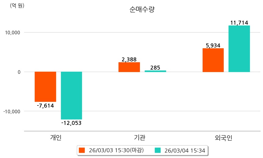 투자자별 동향을 살펴보면 기관은 285억 원 순매수했으며, 외국인은 11,714억 원 순매수했다. 개인은 12,053억 원 순매도했다.