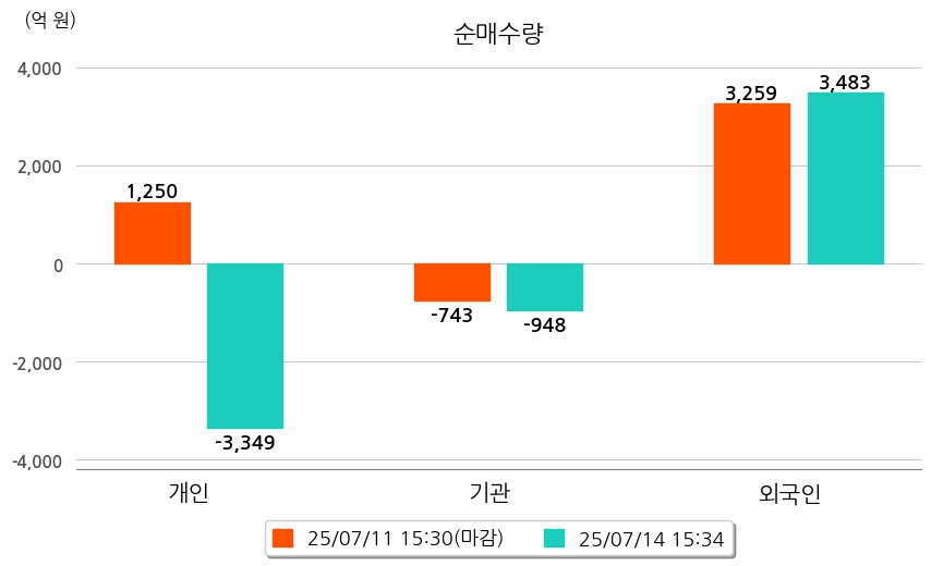 투자자별 동향을 살펴보면 기관은 948억 원 순매도했으며, 외국인은 3,483억 원 순매수했다. 개인은 3,349억 원 순매도했다.
