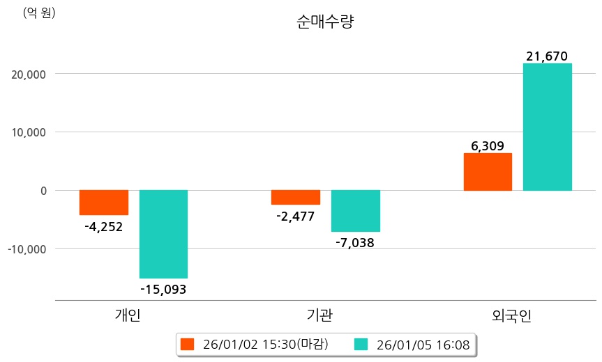투자자별 동향을 살펴보면 기관은 7,038억 원 순매도했으며, 외국인은 21,670억 원 순매수했다. 개인은 15,093억 원 순매도했다.