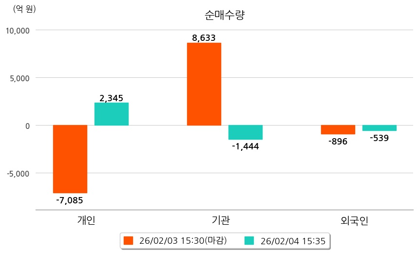 투자자별 동향을 살펴보면 기관은 1,444억 원 순매도했으며, 외국인은 539억 원 순매도했다. 개인은 2,345억 원 순매수했다.