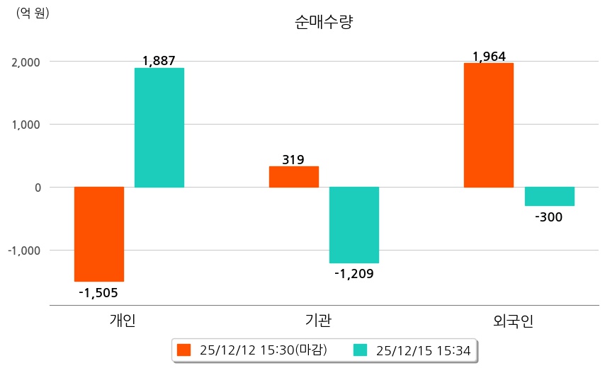 투자자별 동향을 살펴보면 기관은 1,209억 원 순매도했으며, 외국인은 300억 원 순매도했다. 개인은 1,887억 원 순매수했다.