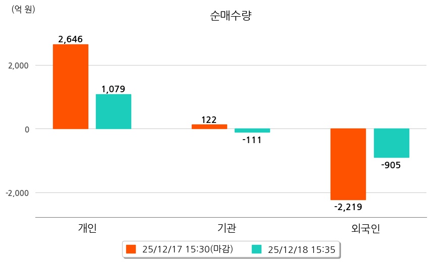 투자자별 동향을 살펴보면 기관은 111억 원 순매도했으며, 외국인은 905억 원 순매도했다. 개인은 1,079억 원 순매수했다.