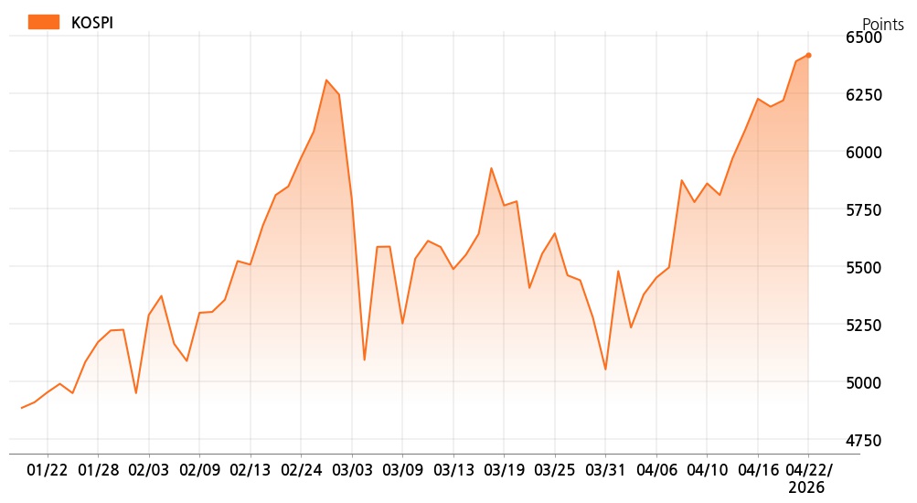 22일 오후 3시 코스피(6,417.93p, 29.46p, +0.46%)는 개인 매수가 늘면서 상승세를 보이고 있다.