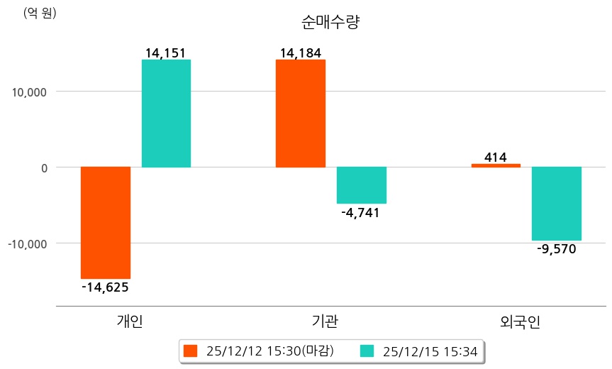 투자자별 동향을 살펴보면 기관은 4,741억 원 순매도했으며, 외국인은 9,570억 원 순매도했다. 개인은 14,151억 원 순매수했다.