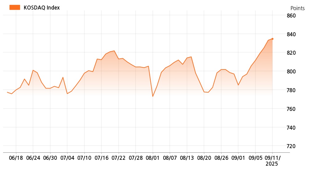 11일 오후 3시 코스닥(834.76p, 1.76p, +0.21%)는 개인 매수가 늘면서 상승세를 보이고 있다.