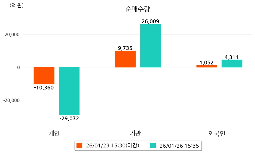 투자자별 동향을 살펴보면 기관은 26,009억 원 순매수했으며, 외국인은 4,311억 원 순매수했다. 개인은 29,072억 원 순매도했다.