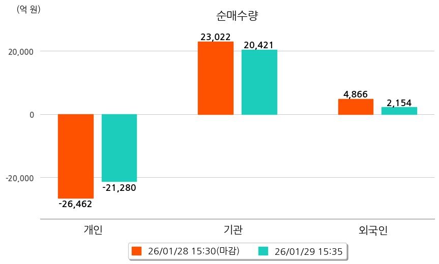 투자자별 동향을 살펴보면 기관은 20,421억 원 순매수했으며, 외국인은 2,154억 원 순매수했다. 개인은 21,280억 원 순매도했다.