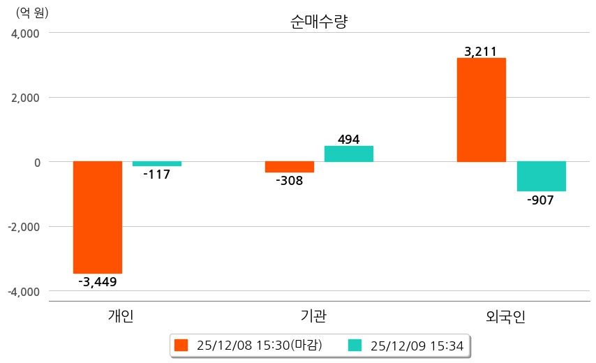 투자자별 동향을 살펴보면 기관은 494억 원 순매수했으며, 외국인은 907억 원 순매도했다. 개인은 117억 원 순매도했다.