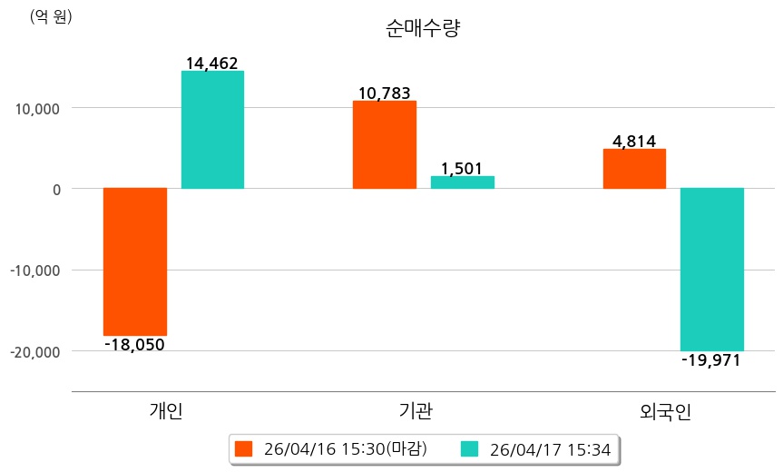 투자자별 동향을 살펴보면 기관은 1,501억 원 순매수했으며, 외국인은 19,971억 원 순매도했다. 개인은 14,462억 원 순매수했다.