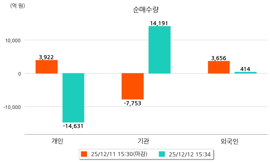투자자별 동향을 살펴보면 기관은 14,191억 원 순매수했으며, 외국인은 414억 원 순매수했다. 개인은 14,631억 원 순매도했다.