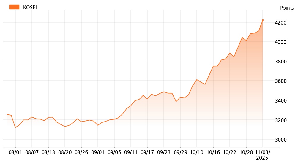 3일 오후 3시 코스피(4,221.87p, 114.37p, +2.78%)는 개인 매수가 늘면서 상승세를 보이고 있다.