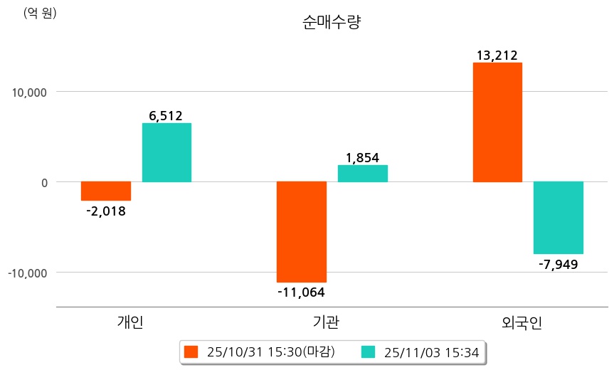 투자자별 동향을 살펴보면 기관은 1,854억 원 순매수했으며, 외국인은 7,949억 원 순매도했다. 개인은 6,512억 원 순매수했다.