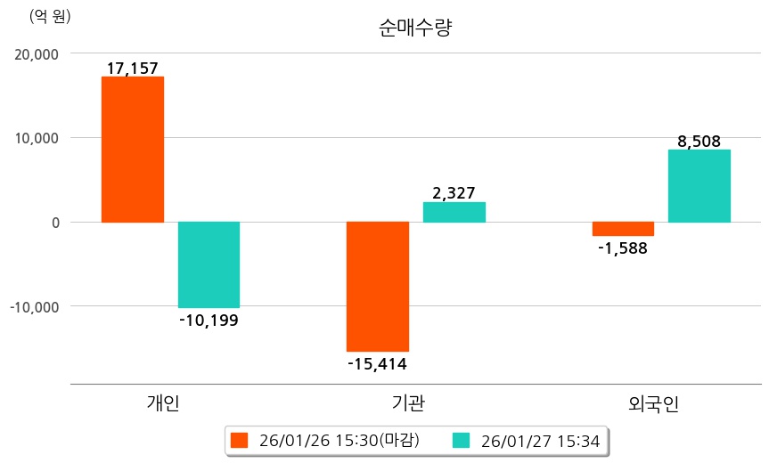 투자자별 동향을 살펴보면 기관은 2,327억 원 순매수했으며, 외국인은 8,508억 원 순매수했다. 개인은 10,199억 원 순매도했다.