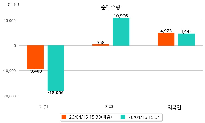 투자자별 동향을 살펴보면 기관은 10,976억 원 순매수했으며, 외국인은 4,644억 원 순매수했다. 개인은 18,006억 원 순매도했다.