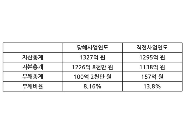 또한, 이번사업연도의 자산총계는 1327억 원으로 직전사업연도 대비 2.47% 증가한 한편, 부채총계는 100억 2천만 원으로 -36.21% 감소, 자본총계는 1226억 8천만 원으로 7.81% 증가했다.