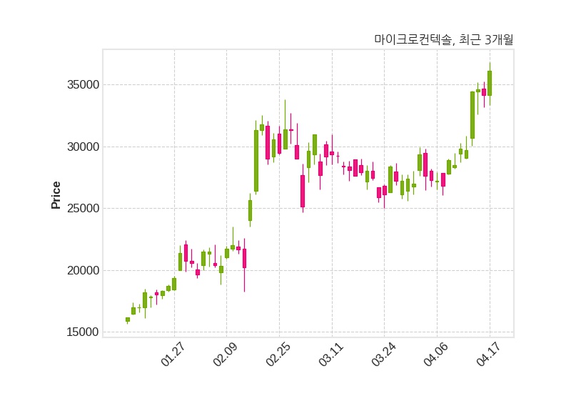 한편, 마이크로컨텍솔은 장 마감 이후 해당 기업공시를 발표했으며 오늘 종가가 36,100원, 거래량은 192,150주로, 직전 거래일 대비 1,950원(+5.71%) 상승했다.