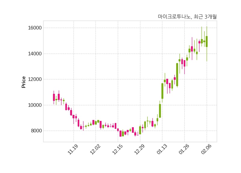 한편, 마이크로투나노는 장 마감 이후 해당 기업공시를 발표했으며 오늘 종가가 15,350원, 거래량은 121,102주로, 직전 거래일 대비 350원(+2.33%) 상승했다.