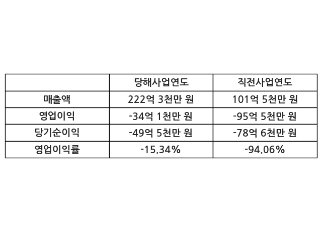 이번사업연도의 매출액은 직전사업연도 대비 118.96% 증가한 222억 3천만 원, 영업이익은 -34억 1천만 원, 당기순이익은 -49억 5천만 원이라고 공시했다.