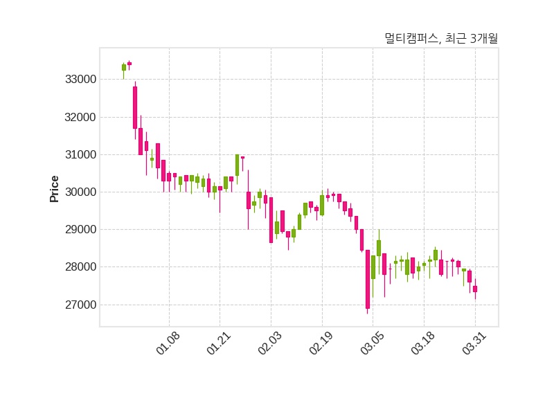 멀티캠퍼스는 정석목에서 안재우로 대표이사를 변경했다고 31일 공시했다. 변경 사유는 임기만료이다. 한편, 멀티캠퍼스는 장 마감 이후 해당 기업공시를 발표했으며 오늘 종가가 27,350원, 거래량은 4,918주로, 직전 거래일 대비 250원(-0.91%) 하락했다.공시 전문으로 이동
