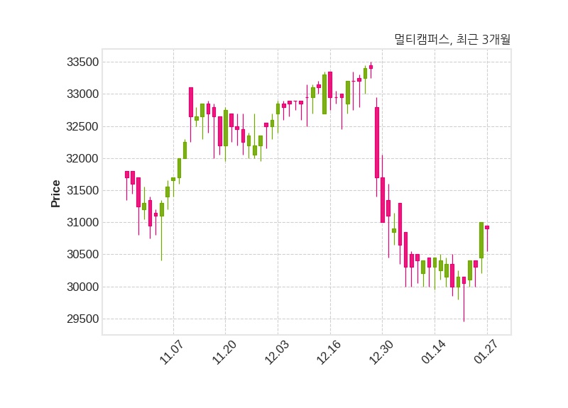 한편, 멀티캠퍼스는 장 마감 이후 해당 기업공시를 발표했으며 오늘 종가가 30,900원, 거래량은 6,188주로, 직전 거래일 대비 100원(-0.32%) 하락했다.