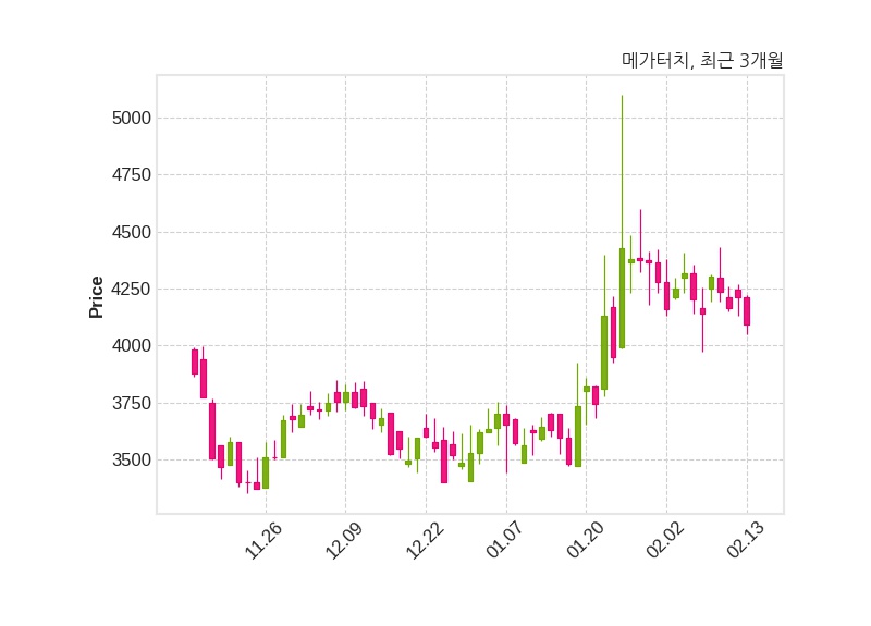 한편, 메가터치는 장 마감 이후 해당 기업공시를 발표했으며 오늘 종가가 4,090원, 거래량은 131,061주로, 직전 거래일 대비 120원(-2.85%) 하락했다.