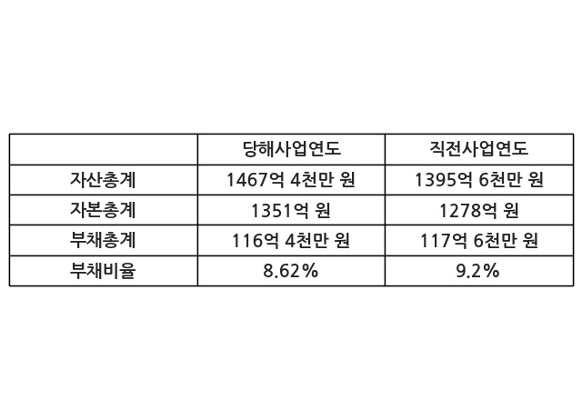 또한, 이번사업연도의 자산총계는 1467억 4천만 원으로 직전사업연도 대비 5.14% 증가한 한편, 부채총계는 116억 4천만 원으로 -1.04% 감소, 자본총계는 1351억 원으로 5.71% 증가했다.