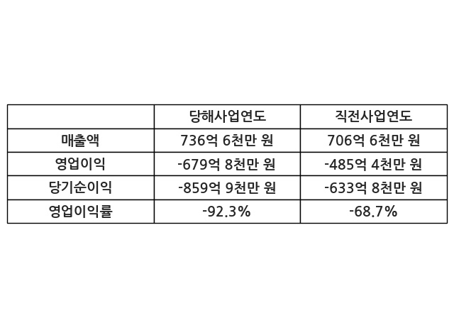 이번사업연도의 매출액은 직전사업연도 대비 4.25% 증가한 736억 6천만 원, 영업이익은 -679억 8천만 원, 당기순이익은 -859억 9천만 원이라고 공시했다.