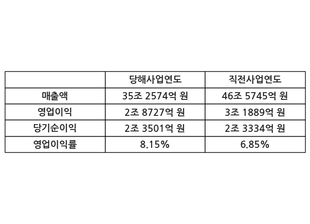 이번사업연도의 매출액은 직전사업연도 대비 -24.3% 감소한 35조 2574억 원, 영업이익은 2조 8727억 원, 당기순이익은 2조 3501억 원이라고 공시했다.