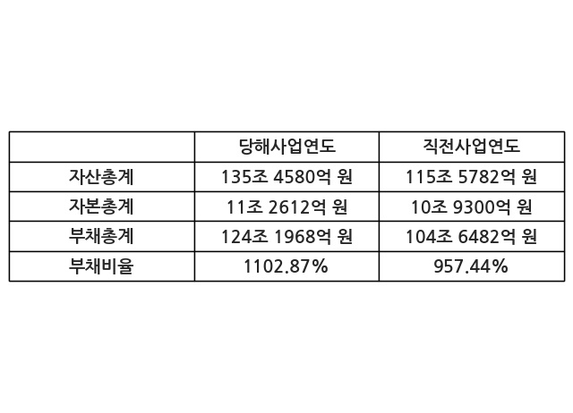 또한, 이번사업연도의 자산총계는 135조 4580억 원으로 직전사업연도 대비 17.2% 증가한 한편, 부채총계는 124조 1968억 원으로 18.68% 증가, 자본총계는 11조 2612억 원으로 3.03% 증가했다.
