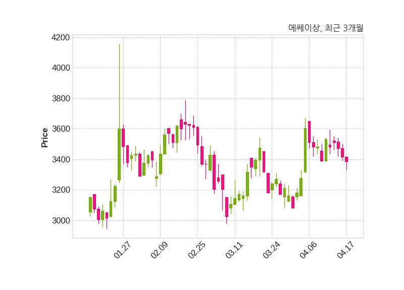 한편, 메쎄이상의 13시 39분 현재주가는 3,385원으로 직전 거래일 대비 30원(-0.88%) 하락이며, 거래량은 26,767주이다.