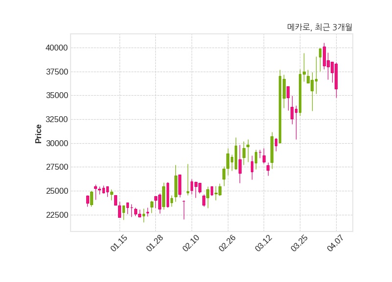 한편, 메카로는 장 마감 이후 해당 기업공시를 발표했으며 오늘 종가가 35,700원, 거래량은 30,903주로, 직전 거래일 대비 1,700원(-4.55%) 하락했다.