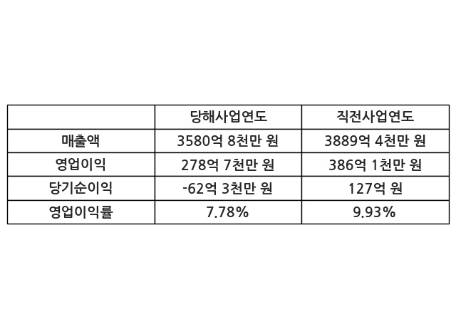 이번사업연도의 매출액은 직전사업연도 대비 -7.93% 감소한 3580억 8천만 원, 영업이익은 278억 7천만 원, 당기순이익은 -62억 3천만 원이라고 공시했다.