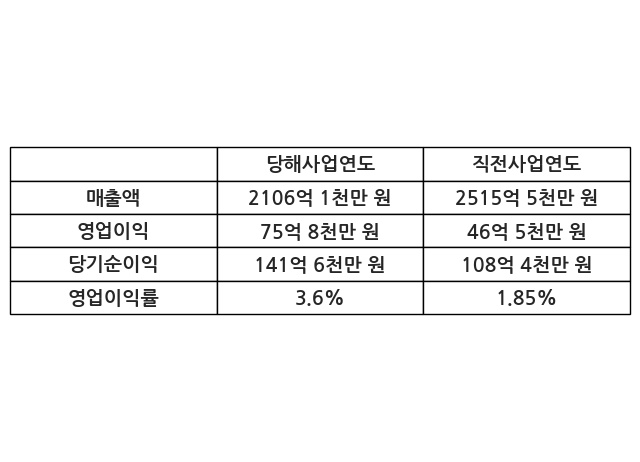 이번사업연도의 매출액은 직전사업연도 대비 -16.28% 감소한 2106억 1천만 원, 영업이익은 75억 8천만 원, 당기순이익은 141억 6천만 원이라고 공시했다.