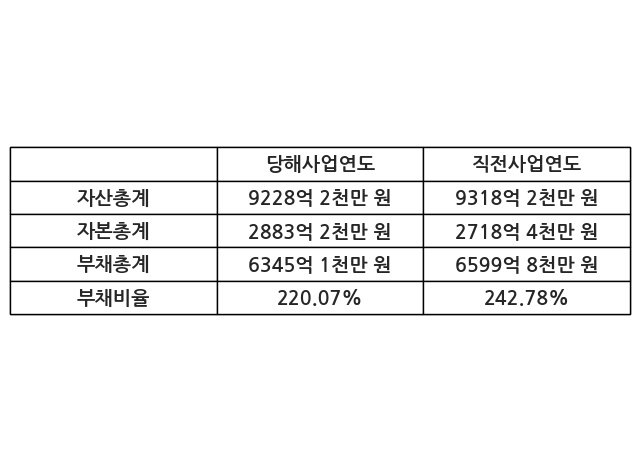 또한, 이번사업연도의 자산총계는 9228억 2천만 원으로 직전사업연도 대비 -0.97% 감소한 한편, 부채총계는 6345억 1천만 원으로 -3.86% 감소, 자본총계는 2883억 2천만 원으로 6.06% 증가했다.