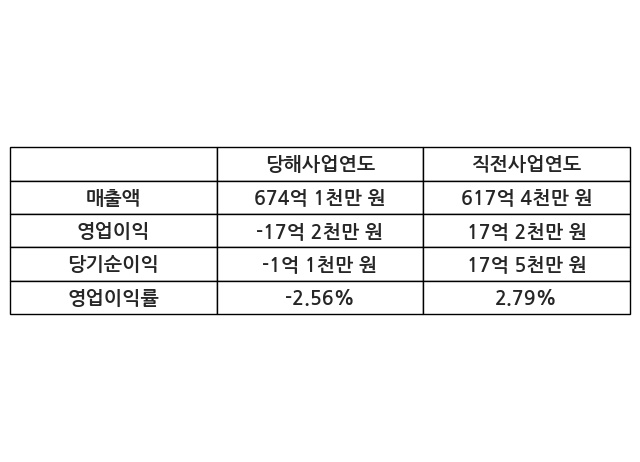 이번사업연도의 매출액은 직전사업연도 대비 9.19% 증가한 674억 1천만 원, 영업이익은 -17억 2천만 원, 당기순이익은 -1억 1천만 원이라고 공시했다.