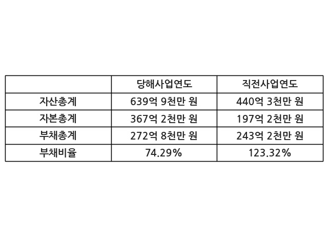 또한, 이번사업연도의 자산총계는 639억 9천만 원으로 직전사업연도 대비 45.33% 증가한 한편, 부채총계는 272억 8천만 원으로 12.18% 증가, 자본총계는 367억 2천만 원으로 86.21% 증가했다.