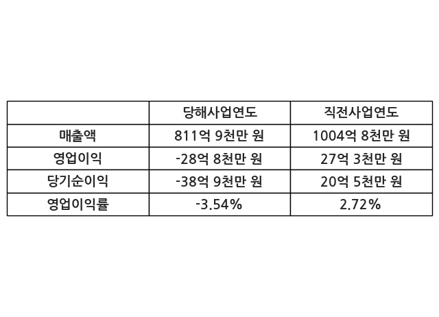 이번사업연도의 매출액은 직전사업연도 대비 -19.2% 감소한 811억 9천만 원, 영업이익은 -28억 8천만 원, 당기순이익은 -38억 9천만 원이라고 공시했다.