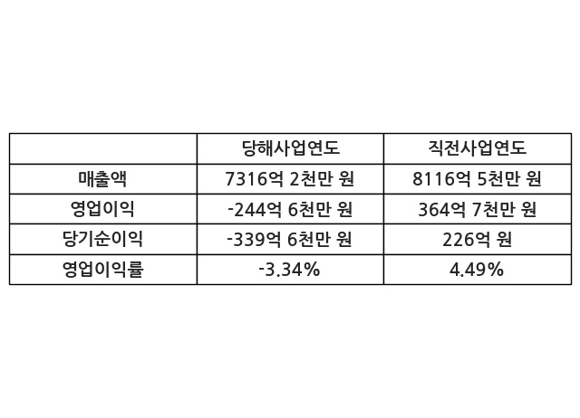 이번사업연도의 매출액은 직전사업연도 대비 -9.86% 감소한 7316억 2천만 원, 영업이익은 -244억 6천만 원, 당기순이익은 -339억 6천만 원이라고 공시했다.