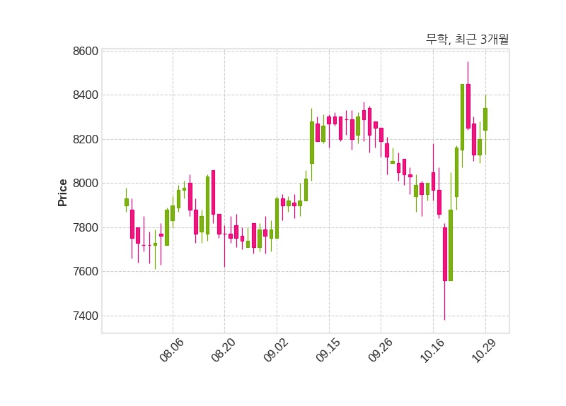 한편, 무학의 11시 54분 현재주가는 8,340원으로 직전 거래일 대비 140원(+1.71%) 상승이며, 거래량은 80,785주이다.