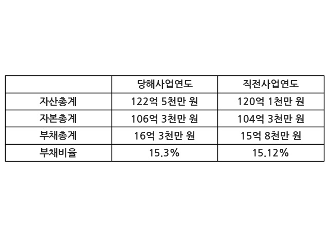 또한, 이번사업연도의 자산총계는 122억 5천만 원으로 직전사업연도 대비 2.01% 증가한 한편, 부채총계는 16억 3천만 원으로 3.04% 증가, 자본총계는 106억 3천만 원으로 1.85% 증가했다.