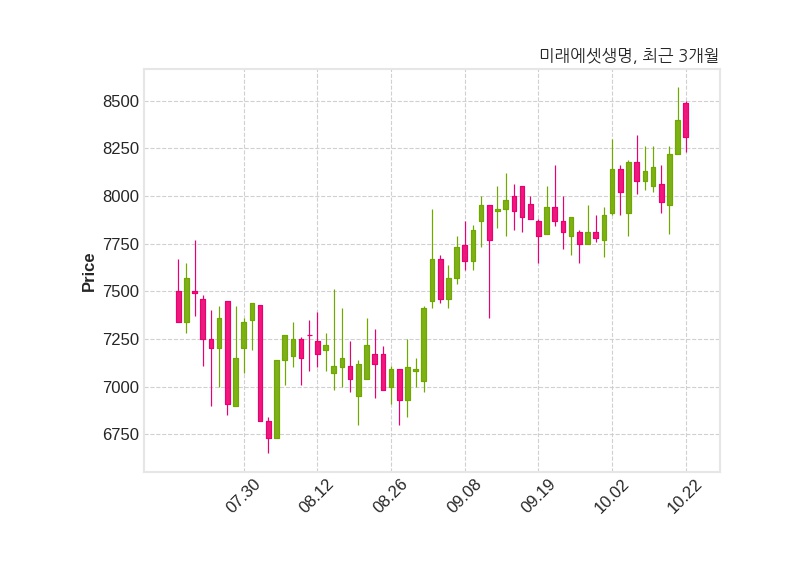 한편, 미래에셋생명은 장 마감 이후 해당 기업공시를 발표했으며 오늘 종가가 8,310원, 거래량은 87,267주로, 직전 거래일 대비 90원(-1.07%) 하락했다.