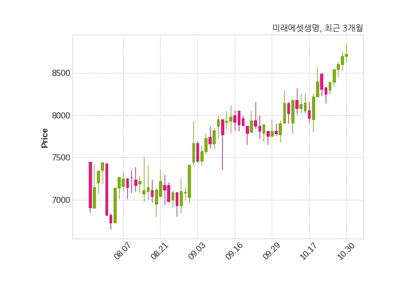 한편, 미래에셋생명은 장 마감 이후 해당 기업공시를 발표했으며 오늘 종가가 8,720원, 거래량은 147,518주로, 직전 거래일 대비 20원(+0.23%) 상승했다.