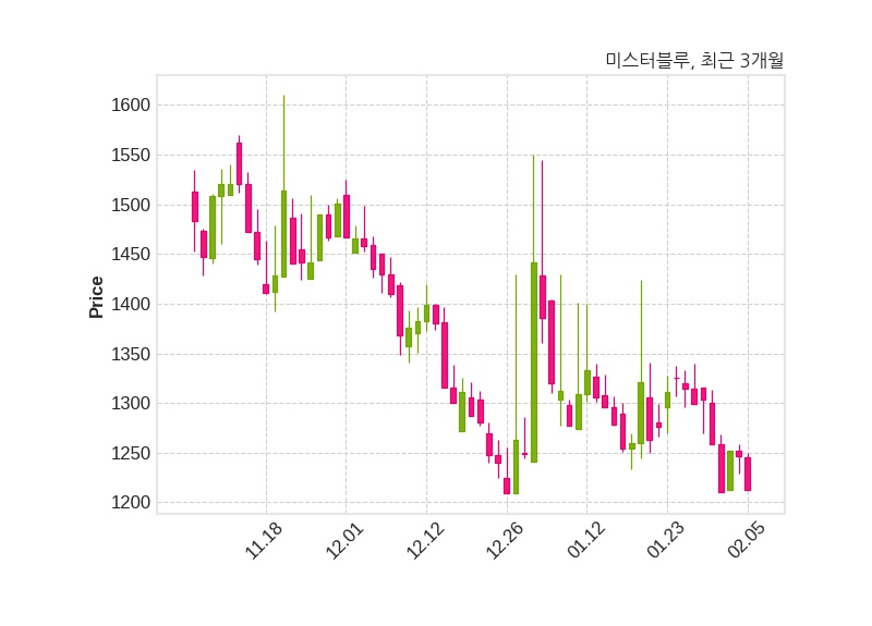 한편, 미스터블루는 장 마감 이후 해당 기업공시를 발표했으며 오늘 종가가 1,212원, 거래량은 285,775주로, 직전 거래일 대비 34원(-2.73%) 하락했다.