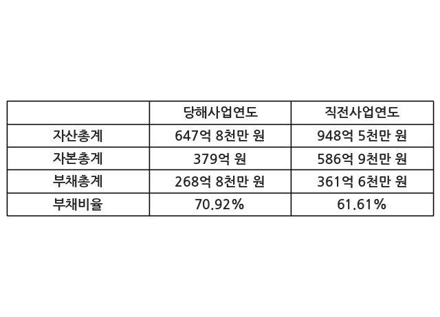 또한, 이번사업연도의 자산총계는 647억 8천만 원으로 직전사업연도 대비 -31.71% 감소한 한편, 부채총계는 268억 8천만 원으로 -25.67% 감소, 자본총계는 379억 원으로 -35.43% 감소했다.