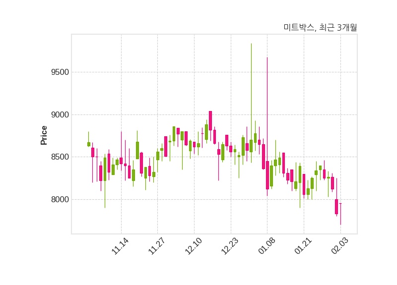 한편, 미트박스는 장 마감 이후 해당 기업공시를 발표했으며 오늘 종가가 7,950원, 거래량은 77,225주로, 직전 거래일 대비 120원(+1.53%) 상승했다.